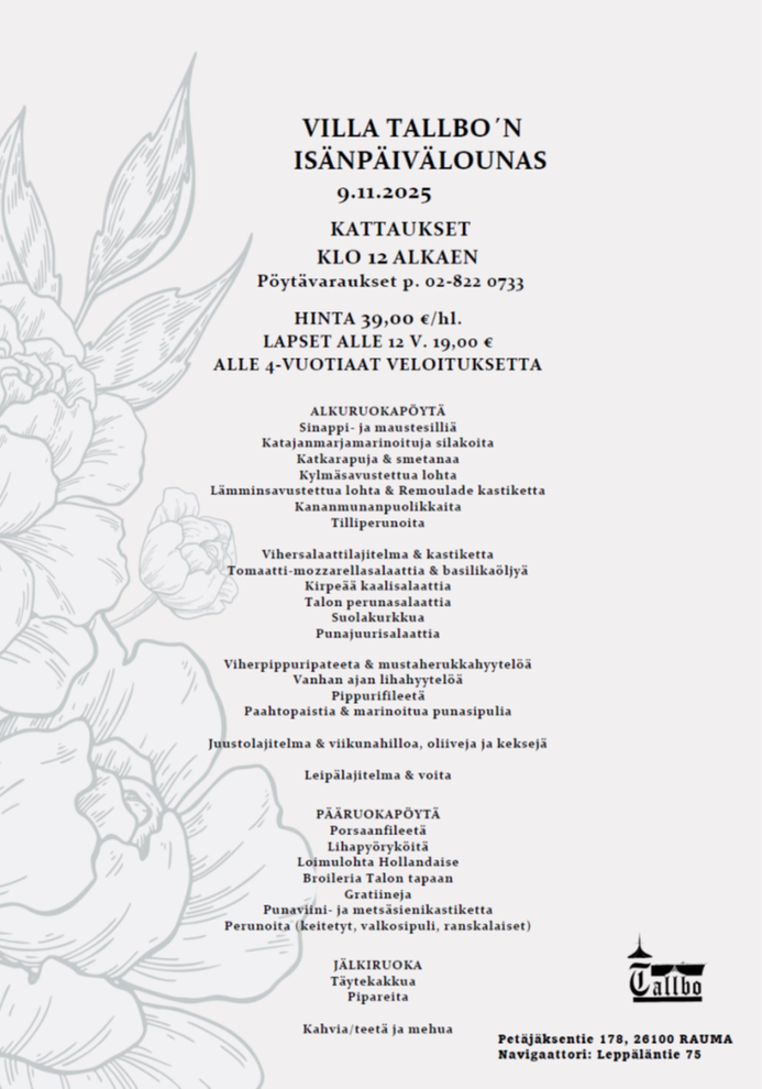 Tallbo-ravintolat tarjoavat herkullista ruokaa idyllisessä ympäristössä. Ravintola Villa Tallbo ja Juhla Tallbo sijaitsevat samassa pihapiirissä Rauman keskustan läheisyydessä.