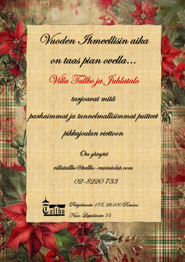 Tallbo-ravintolat tarjoavat herkullista ruokaa idyllisessä ympäristössä. Ravintola Villa Tallbo ja Juhla Tallbo sijaitsevat samassa pihapiirissä Rauman keskustan läheisyydessä.